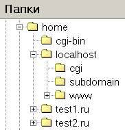 /homeдиректорию с именем, совпадающим с именем виртуального хоста (в нашем случаеtest1.ru). Да-да, вы правильно поняли: имя директории содержит точку. Эта директория будет хранить директории документов доменов третьего уровня дляtest1.ru. Непонятно?.. Например, имяabc.test1.ruсвязывается сервером с директорией/home/test1.ru/abc/, а имяabc.def.test1.ru— с/home/test1.ru/abc.def/. Ну и, конечно, поддиректорияwwwсоответствует адресамwww.test1.ruи простоtest1.ru. В общем, дешево и сердито. На рисунке показано, как может выглядеть директория/home. Не забудьте создать папкуwwwв директории виртуального хоста, ведь именно в ней будут храниться его страницы и скрипты! - Перезапустить сервер, воспользовавшись, например, ярлыком Restart Denwer на Рабочем столе.